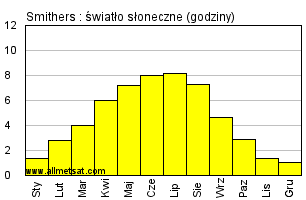 | Miesięczna średnia liczba godzin światła słonecznego w ciągu dnia. |