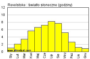 | Miesięczna średnia liczba godzin światła słonecznego w ciągu dnia. |