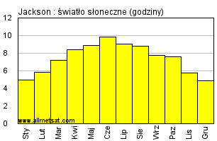 | Miesięczna średnia liczba godzin światła słonecznego w ciągu dnia. |