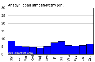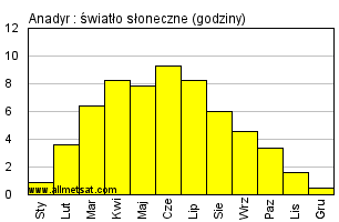 | Miesięczna średnia liczba godzin światła słonecznego w ciągu dnia. |