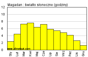 | Miesięczna średnia liczba godzin światła słonecznego w ciągu dnia. |