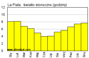 | Miesięczna średnia liczba godzin światła słonecznego w ciągu dnia. |