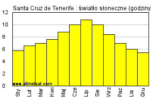 | Miesięczna średnia liczba godzin światła słonecznego w ciągu dnia. |